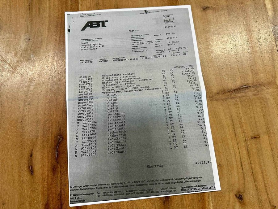 De auto is in 2022 bij een kilometerstand van 30.000 voorzien van een nieuwe motor (facturen aanwezig). Dit is gedaan door een ABT / Audi specialist. Onderaan de streep heeft de vorige eigenaar hier maar liefst €38.000,- voor moeten neerleggen.