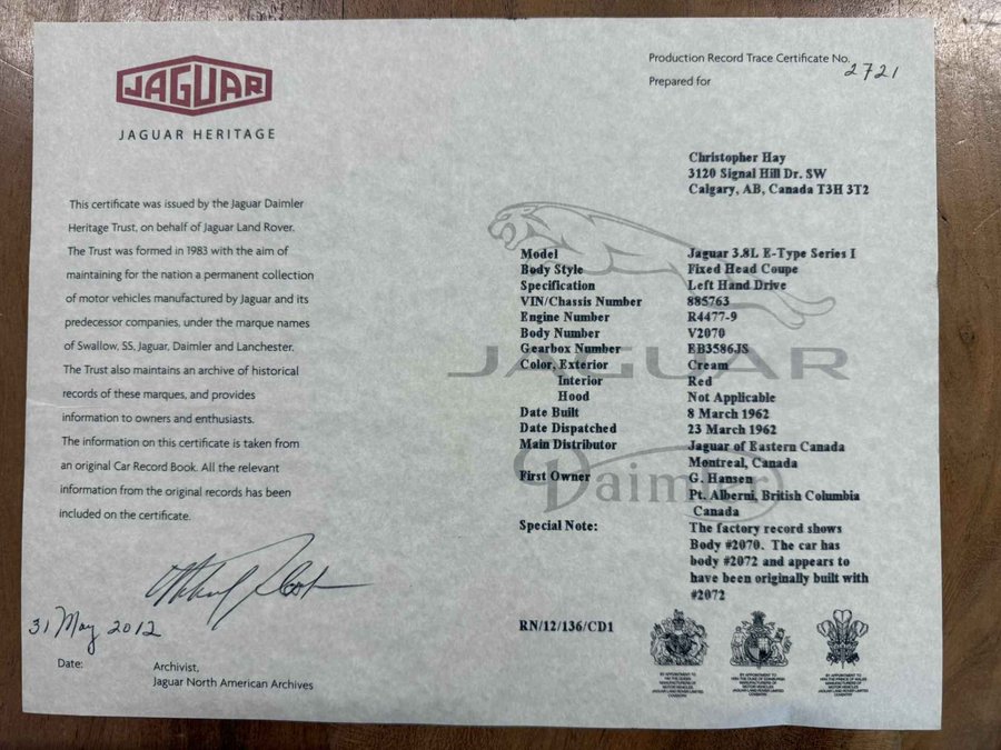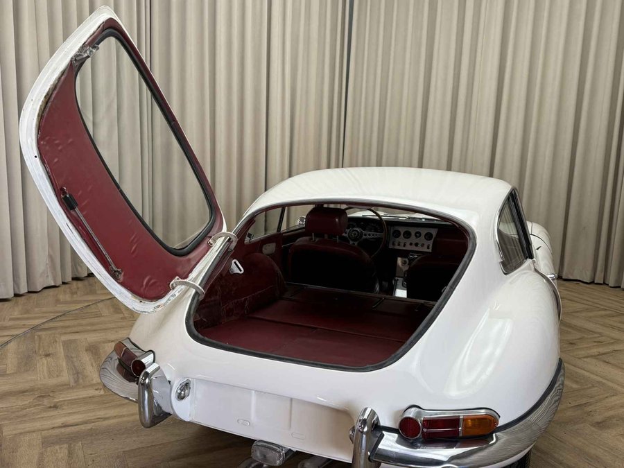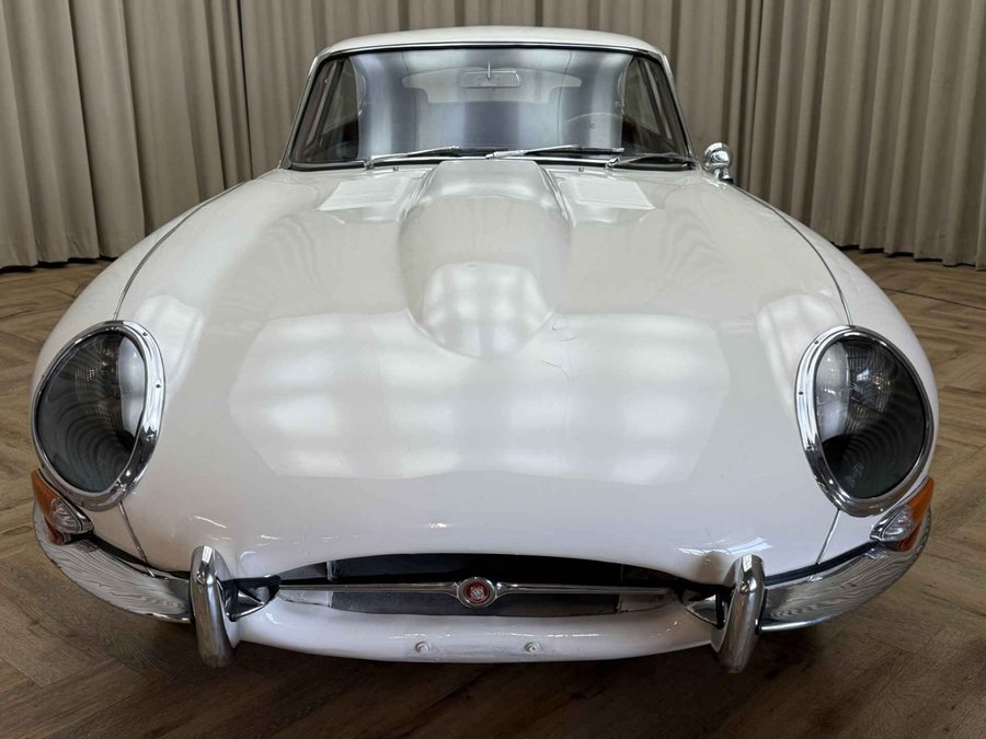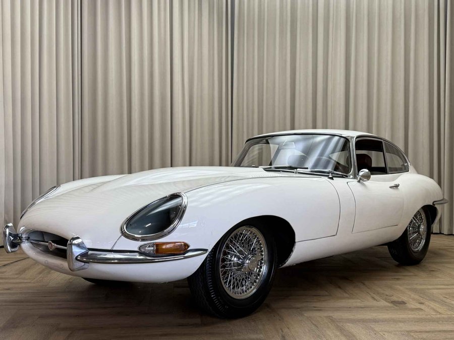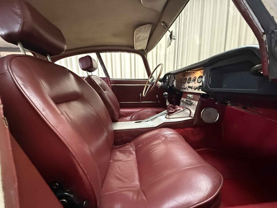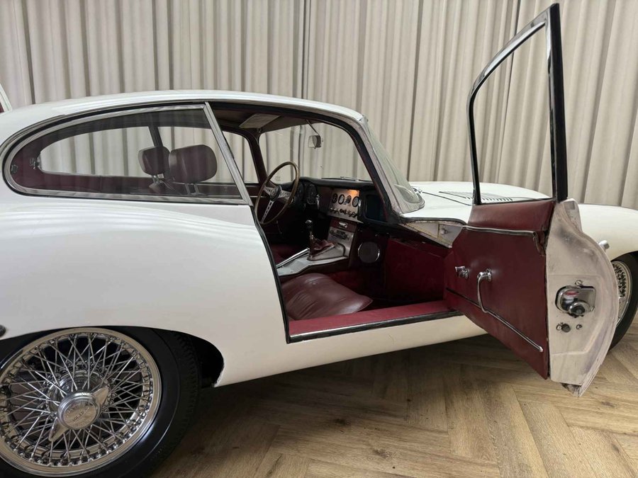 Zeer vroege '62 Jaguar E-type 3.8 Series I Fixed Head Coupé (FHC). Op 23 Maart 1962 geleverd aan Dhr G Hansen in Pt Alberni in British Colombia, Canada. Dit was zelfs de 41e E-type coupé geleverd aan Canada (uit navraag bij Jaguar Archives) Geleverd door Jaguar of Eastern Canada in Montreal. Nog altijd in dezelfde kleurstelling zoals de auto destijds uit de fabriek verliet, namelijk crème exterieur met rood leder interieur. Wij hebben bij binnenkomst de motor volledig nagekeken en voorzien van nieuwe cilinderkoppakking, filters, olie, bougie's etc. Er zit tevens een volledig gereviseerd differentieel onder, nieuwe uitlaatdempers en Wilwood remschijven. Tevens nog diverse reserve onderdelen waaronder de originele rood lederen bucket seats. Tevens veel documentatie bij de auto inclusief het Jaguar Heritage certificaat. Zelfs facturen van het onderhoud die terug gaan tot de jaren '70! De auto is voorzien van een 3.8 liter motor met drie dubbele carburateurs. Dit is niet meer de matching numbers maar dus wel een 3.8 zoals de eerste XKE's hadden. Leuk is ook dat de historie van de auto deels bekend is. Zo is bekend dat de auto 5 eigenaren heeft gehad. Er is ook diverse mail wisseling aanwezig tussen deze eigenaren. Het betreft zeker geen perfect exemplaar, dat zal ook niemand verwachten voor deze prijs. Het feit dat het een vroege 3.8 betreft met een interessante geschiedenis geeft de auto zijn waarde. Technisch in orde, de auto rijdt, remt, loopt en schakelt prima. En zeker in deze (originele) kleurstelling een schitterende verschijning!
